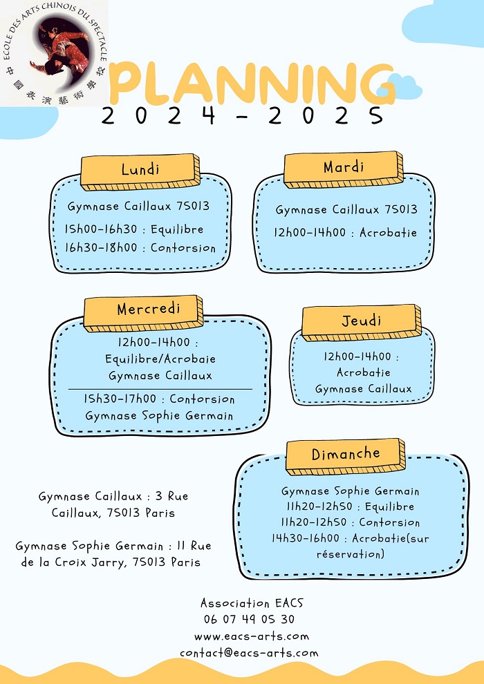 Nota: Pour l’année 2025-2026, le cours d’acrobatie du dimanche nécéssite une réservation à l’avance via le group WhatsApp (envoyer un texto pour réjoindre le groupe au 0607490530) ou scanner ce QR code